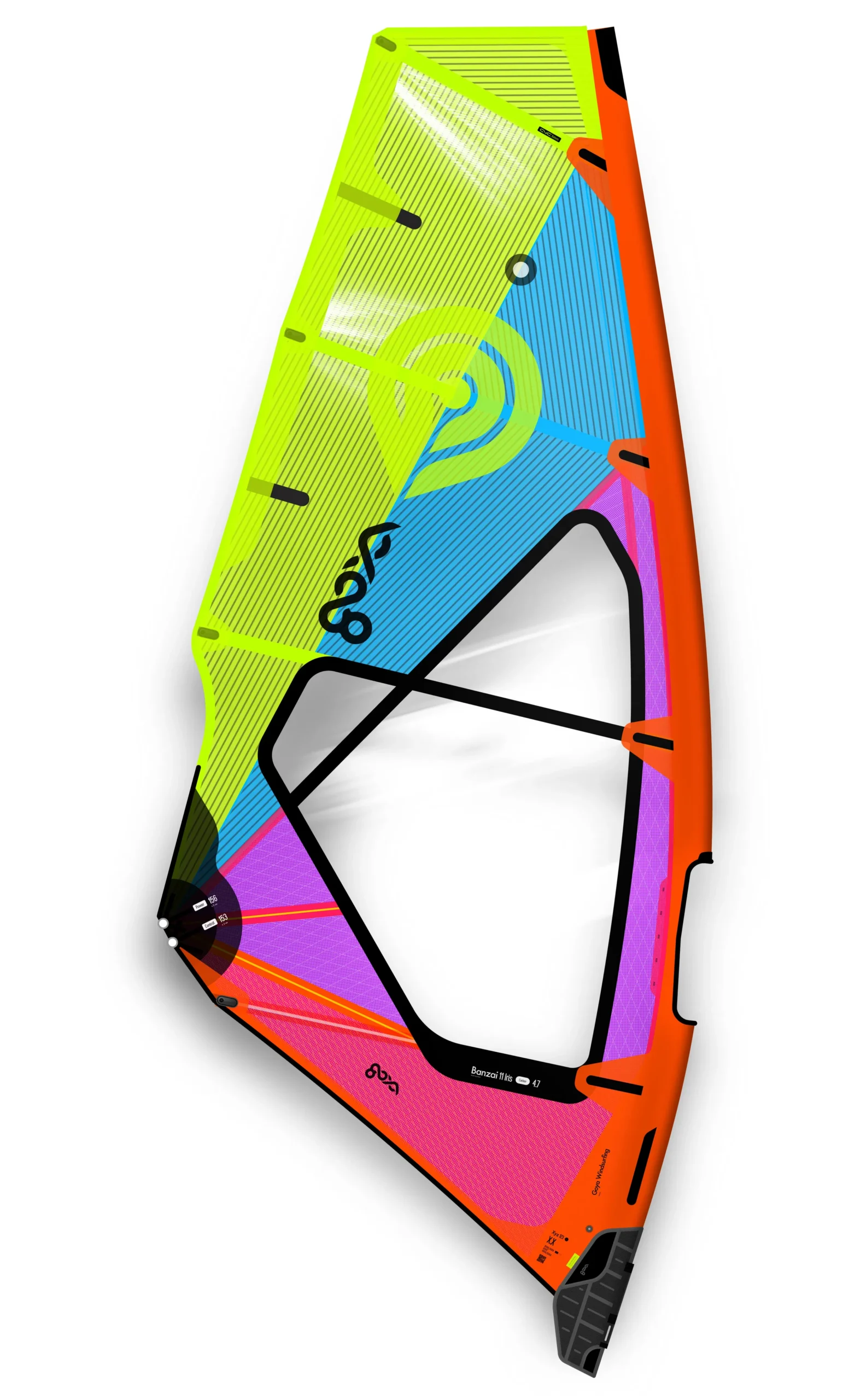 Finestra principale in Bi-PLY da 6 mil di Dimension Polyant, due strati di pellicola PET da 3 mil. Ciò crea una mano più morbida, una flessibilità migliore e una riduzione delle pieghe. Gli inibitori UV presenti nell’adesivo aumentano significativamente la durata del prodotto rispetto al tradizionale monofilm. Finestre superiori in Monfofilm di alta qualità da 4 mil di Dimension Polyant. Pannelli supoeriori colorarti in filati laminati in fibra di carbonio con ordito lineare a bassissima elasticità da 1,5 mil disposti per controllare le linee di carico nella vela combinati con X-Ply aramidico Technora super resistente. Warp Carbon offre un incredibile controllo lineare del profilo della vela consentendo anche un allungamento e un ritorno dinamico, torsionale e diagonale. Questo rende le vele molto silenziose, leggere e ranger molto ampio. Pannelli nella parte inferiore colorati con tela da 2,5 mil di Dimension-Polyant è una tela di poliestere più X-PLY ® progettata per un peso ridotto pur offrendo un’elasticità ridotta di un prodotto tradizionale solo X-PLY ®. Pannello piede/bugna: Aramid Scrim da 4 mil ha una tela migliorata con fibre di denari più grandi, pur mantenendo l’X-PLY ® aramidico ad alta tenacità. Ha una resistenza allo strappo e alla perforazione molto maggiore per il wave riding puro. Doppia cucitura attorno alla finestra principale. Rinforzo del bordo in Dacron Leech. Bordo posteriore piegato sulla tasca dell’albero per evitare sfilacciamenti.