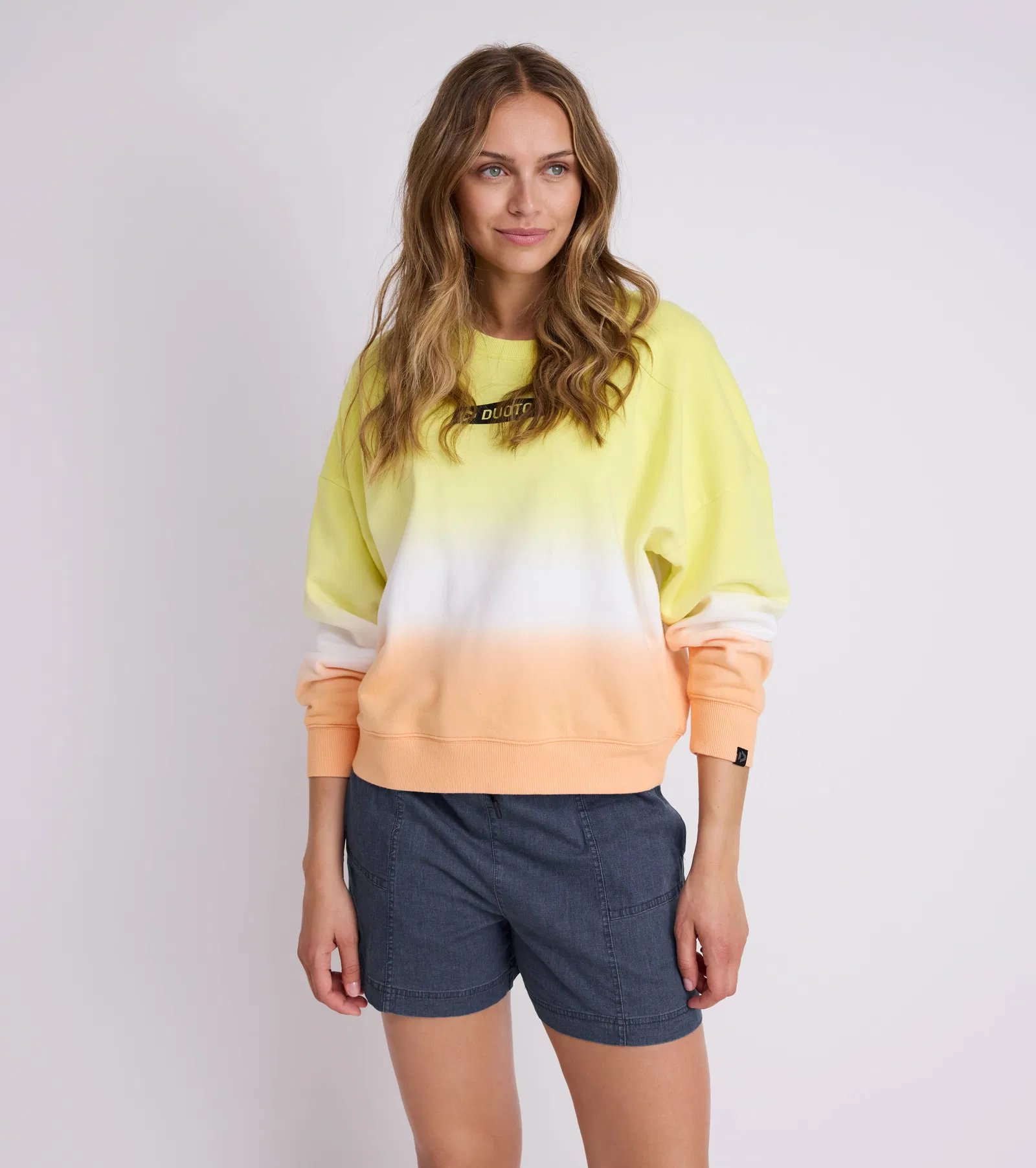 Il punto forte è l’innovativa tecnica di colorazione dip-dye a doppia tintura, che crea una sfumatura unica verso il bianco al centro del capo. Disponibile nel colore honey melon, dona un tocco vivace e originale al tuo outfit.